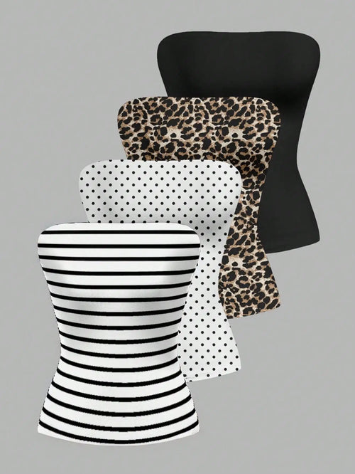 4-Pack Women's Strapless Tube Tops - Striped, Polka Dot, Leopard, Solid Black -